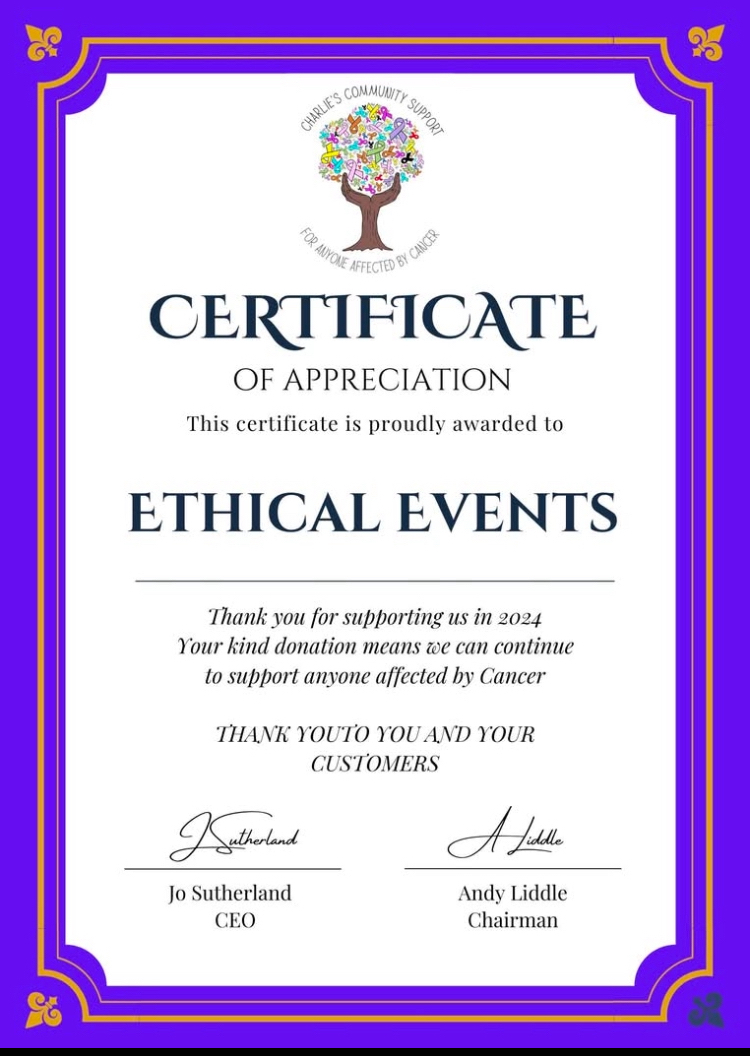 At each event we have held, Ethical Events has collected money for the charity we support, and so far, we have raised £1,317 for Charlie’s Cancer Charity.